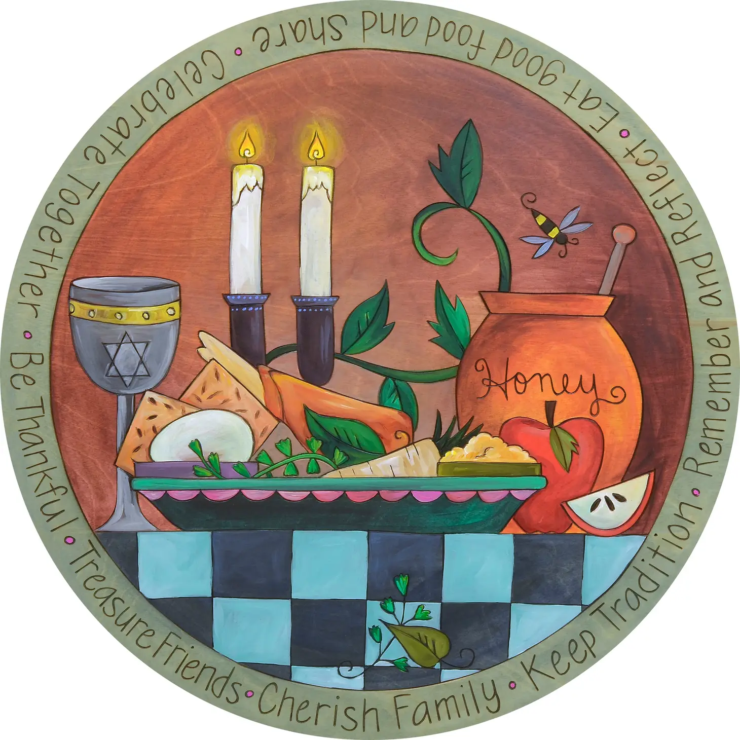 Such a beautiful Sincerely Sticks lazy susan that celebrates Jewish tradition. A colorful tabletop scene with candles, a Star of David goblet, apples and honey and more are surrounded with words on the outer edge including Be Thankful, Treasure Friends, Cherish Family, Keep Tradition, Remember and Reflect ...and more.