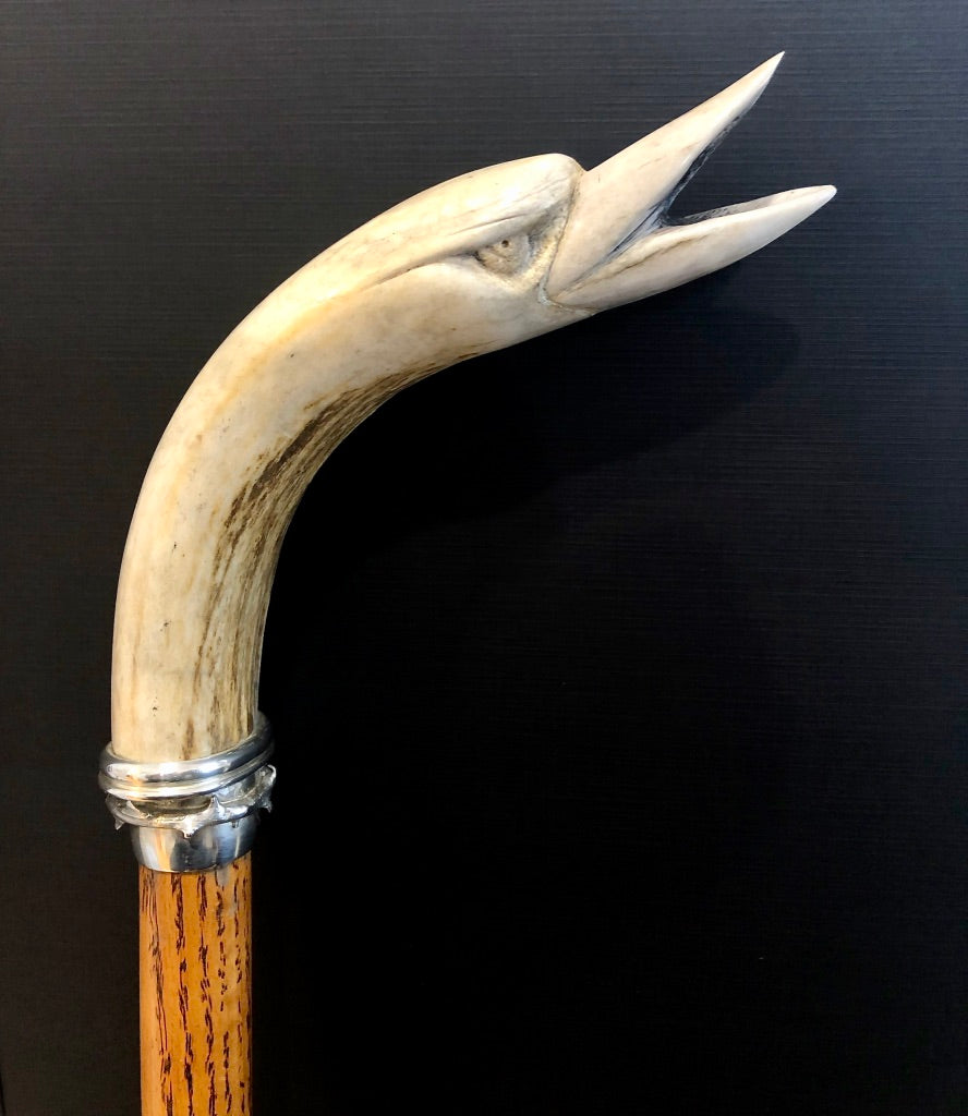 Carved Antler Goose-Head Oak Cane By Wendy Yothers