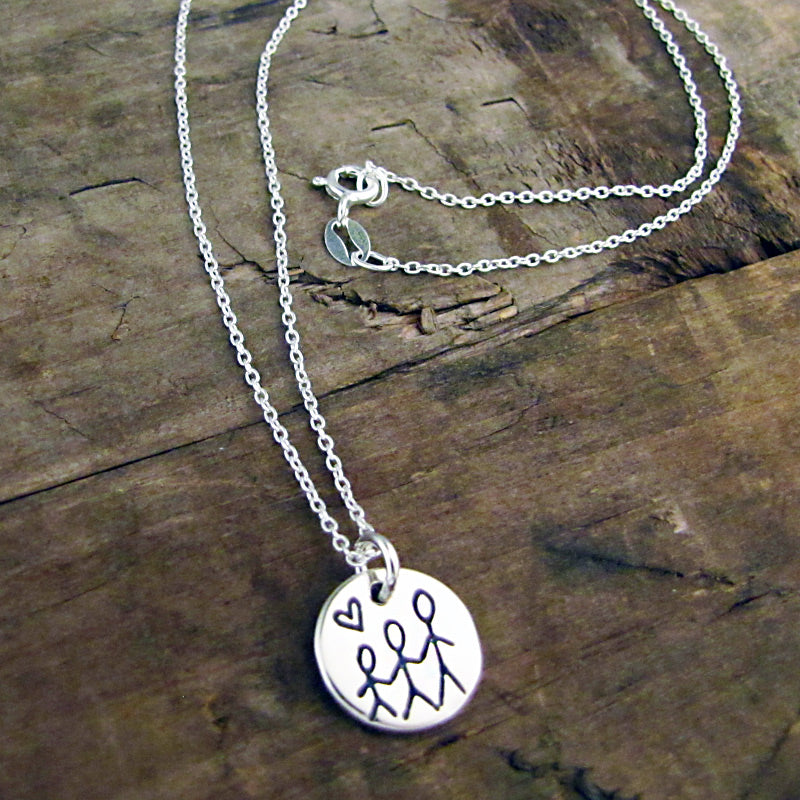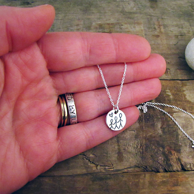 Our etched sterling silver Cherish Family pendant is oxidized to show detail and comes with a shiny finish. The charm measures about 1/2" in diameter and is available as a charm only or hanging on a 16" or 18" sterling silver cable chain with a spring ring clasp. We hand-cast our charms out of recycled sterling silver from Hanni's original etched design; quality stamped.
