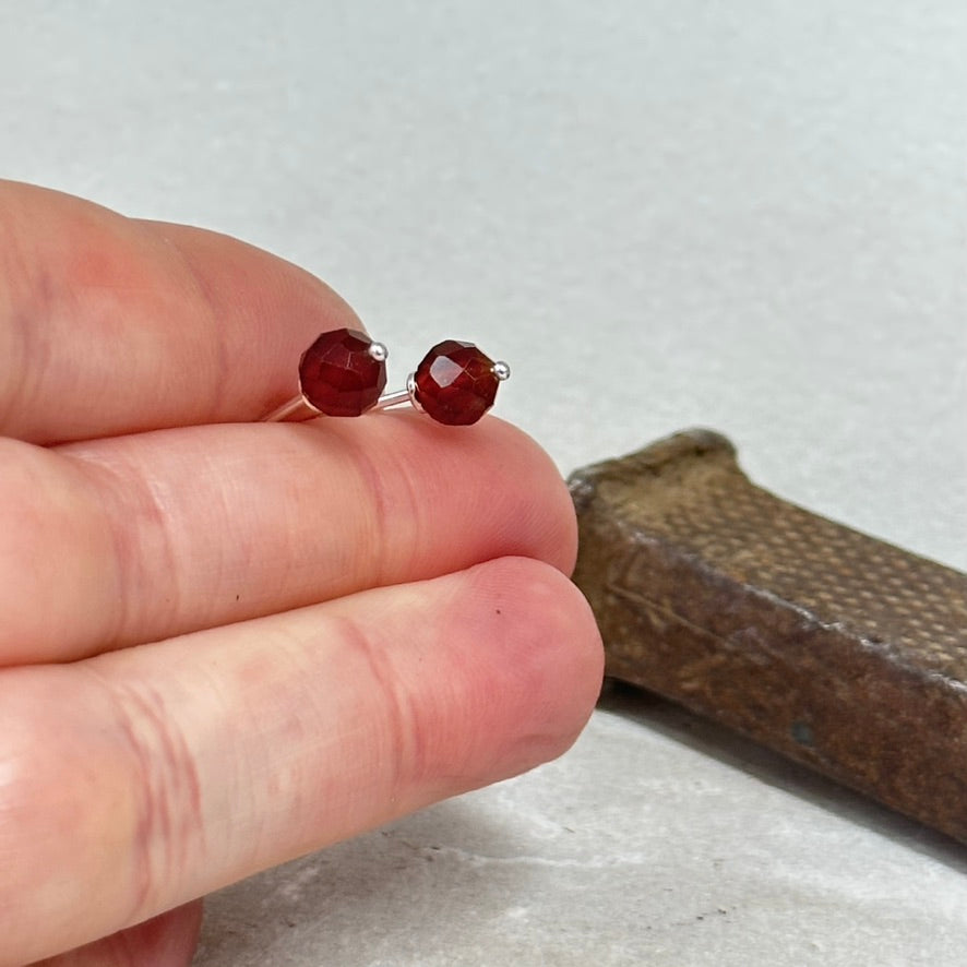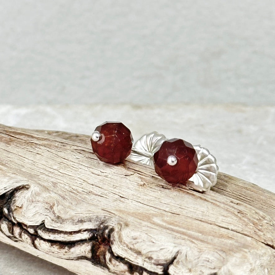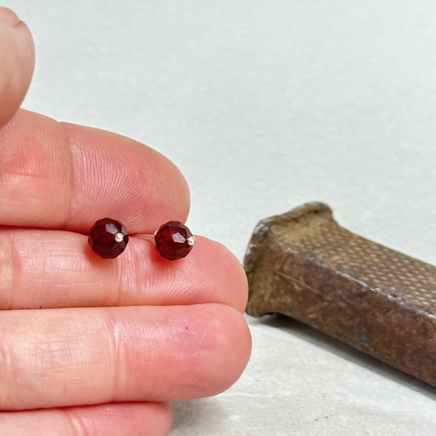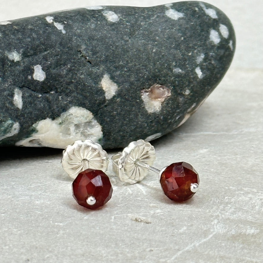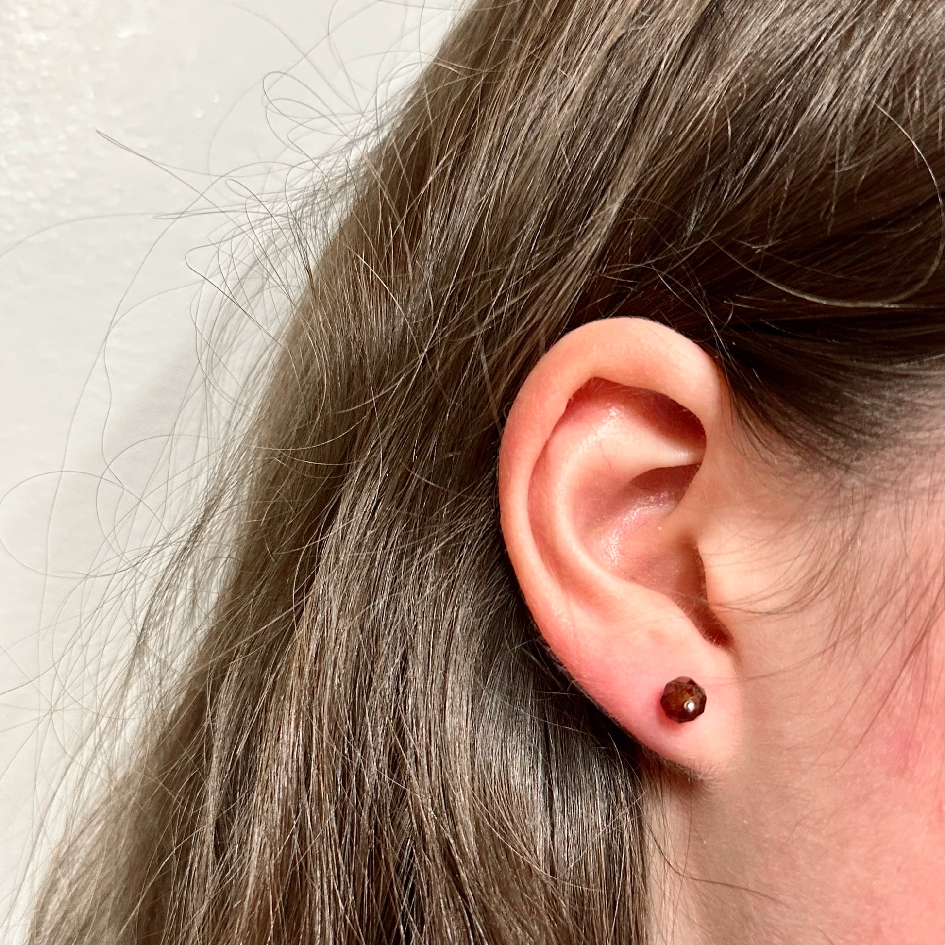 We're in love with the deep color of our stunning 6mm faceted round Hessonite stud earrings, handmade in our northern Michigan studio. These earrings feature the mesmerizing warm orange-brown hue of the Hessonite garnet, cut into a classic round shape and expertly faceted to showcase its natural beauty. Hanni pins the round hessonite garnet stones with melted balls of sterling silver, adding a touch of elegance and ensuring the earrings are both durable and long-lasting. She cuts a notch near the ends of the posts and polishes the tips to make them super comfortable; ships with sterling silver luxury push-backs. Because of how these are made, it is normal if the stones spin a bit on their setting. Ships in our signature silver jewelry box.