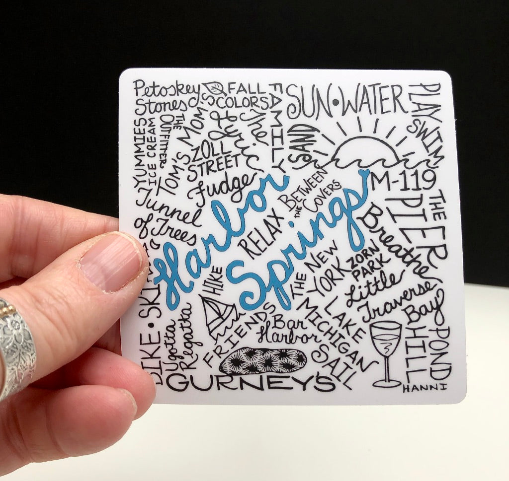Created by Hanni, THE Hanni of Hanni Gallery, the Harbor Springs graffiti sticker is made up of some of our favorite places, from The Outfitter to Yummies, including items and activities such as Petoskey Stones and Ugotta Regatta. It is a perfect token to show your love for this magical place!