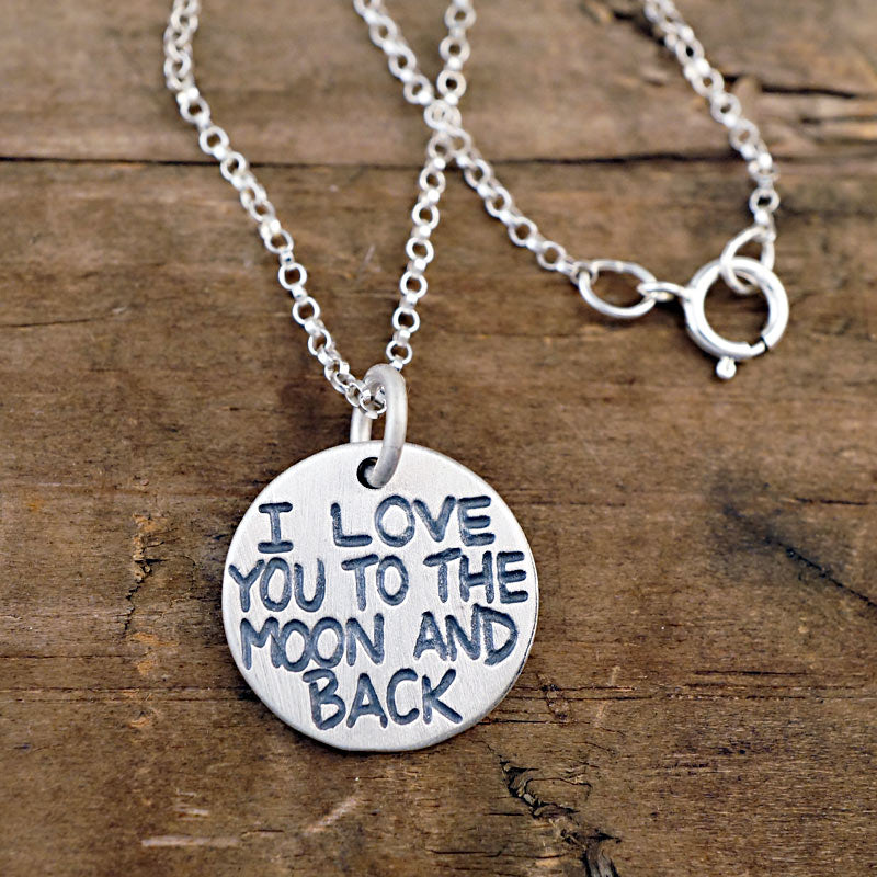 Our sterling silver Love You to the Moon pendant is oxidized to show detail and comes with a brushed matte finish. The charm measures about 5/8" in diameter and is available as a charm only or hanging on a 16", 18" or 20" sterling silver rolo chain with a spring ring clasp. Hand-cast out of recycled sterling silver from Hanni's original etched design; quality stamped.