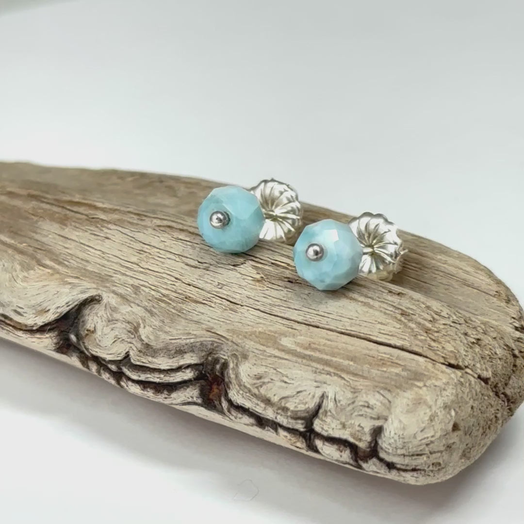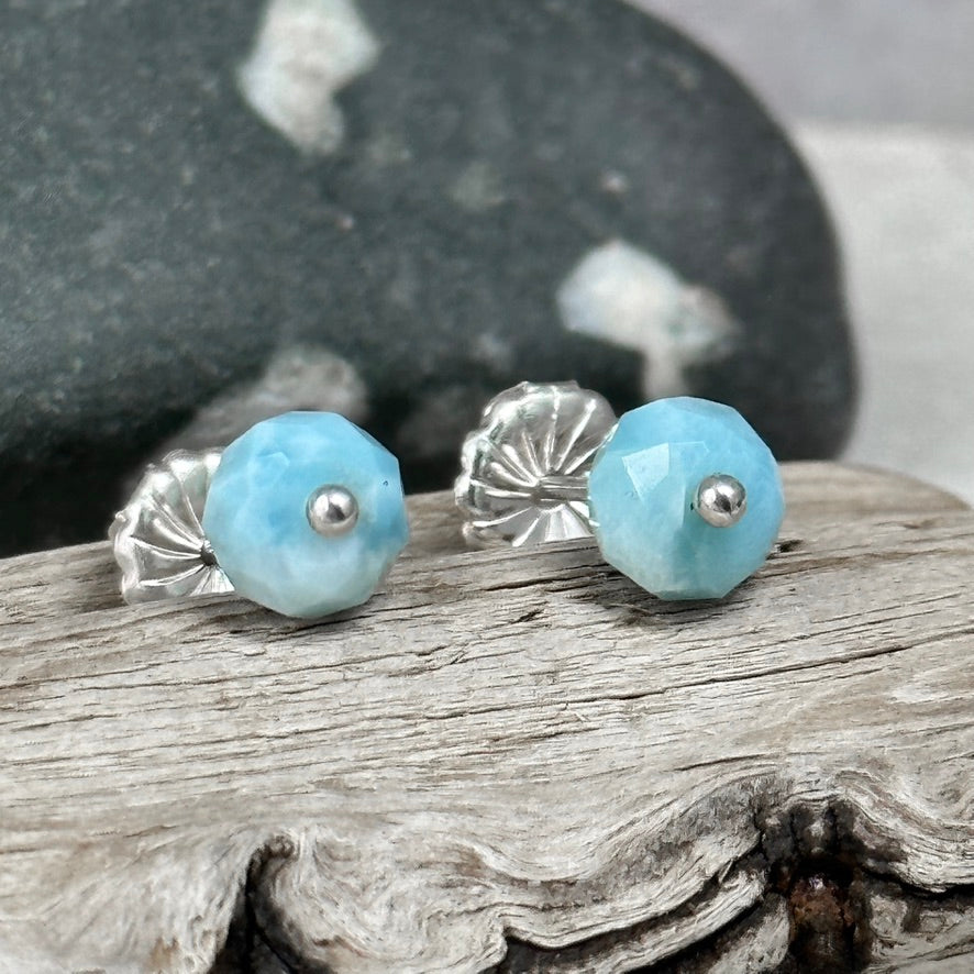Larimar is such an exquisite stone. The sky and water blue of our larimar stud earrings evoke the best days at the beach. Artist handmade in our northern Michigan jewelry studio, Hanni's pinned larimar jewelry posts are made with Argentium (tarnish resistant) silver and backed with large luxury sterling silver friction fit backs. She cuts notches near the ends of the posts, and rounds the tips to make them super comfortable. Because of how these are made, it is normal if the stones spin a bit. A great minimalist earring with silver and stones polished to perfection! Ships in our signature silver jewelry box.