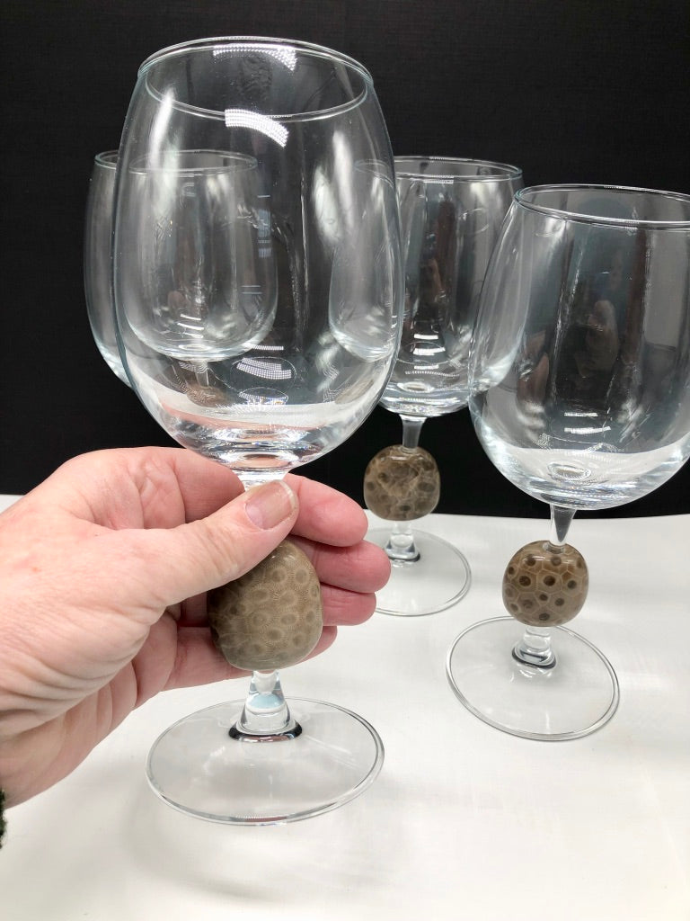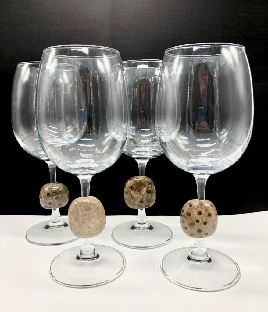 These unique wineglasses are perfect for those who appreciate both wine and Petoskey Stones! As with all things natural, each stone is different, and they are all roughly the same size and have terrific pattern definition. The artist has done a fabulous job of achieving balance for the glasses!