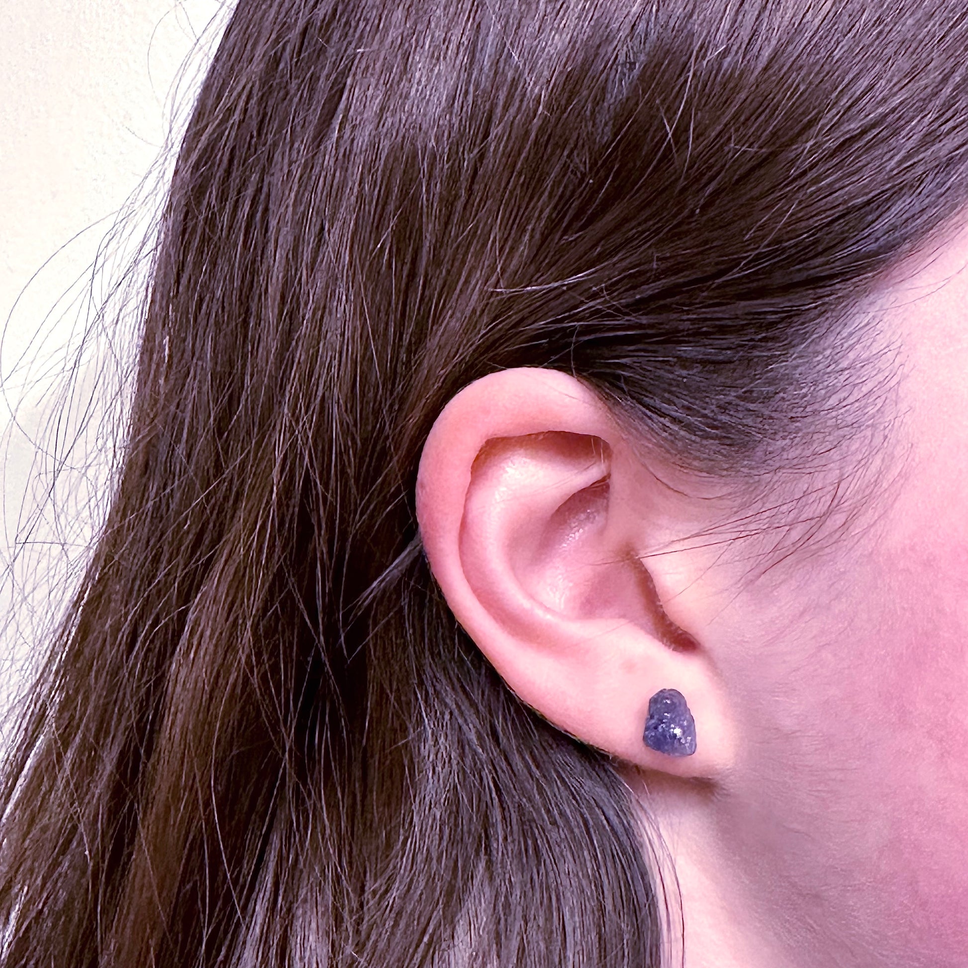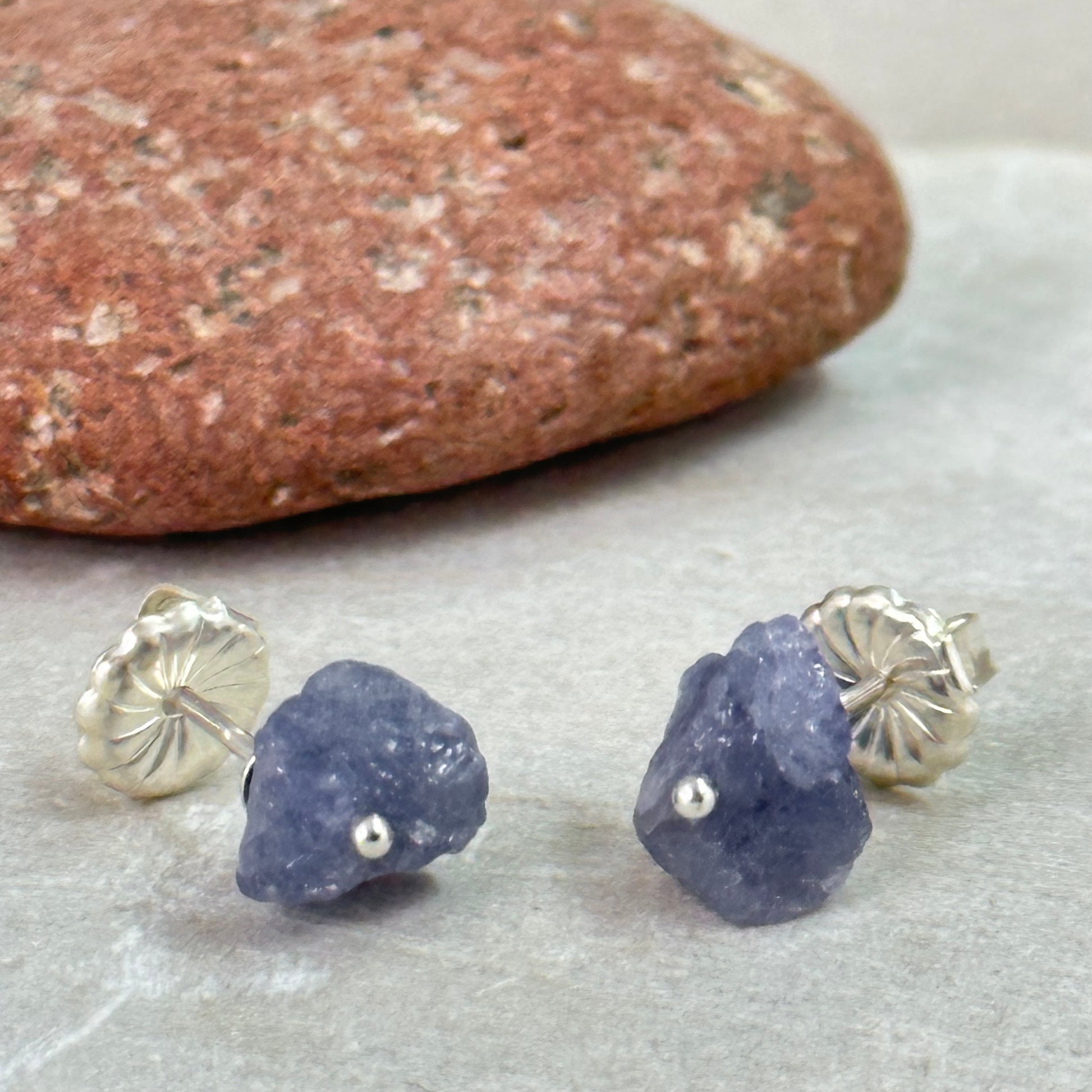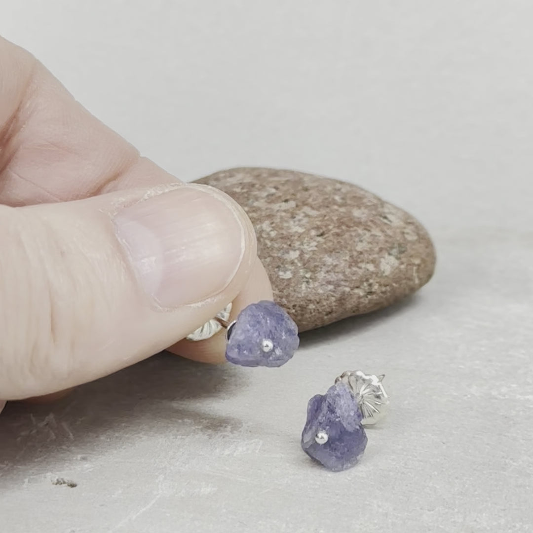 Our pinned tanzanite studs are made with Argentium (tarnish resistant) silver and backed with large luxury sterling silver friction fit backs. Hanni cuts notches near the ends of the posts, and rounds the tips to make them super comfortable. Because of how these are made, it's normal if the stones move a bit on their settings.