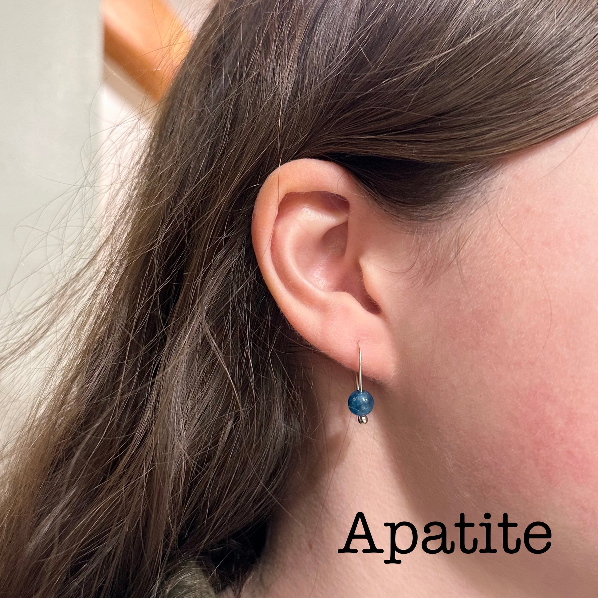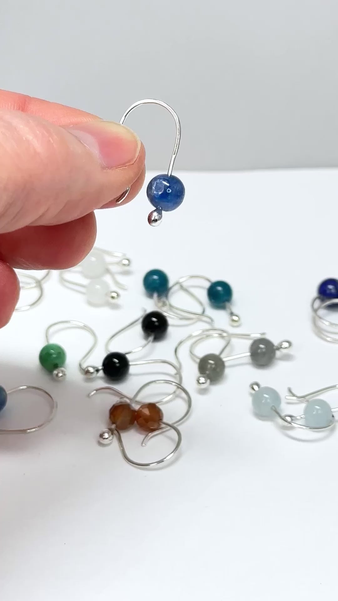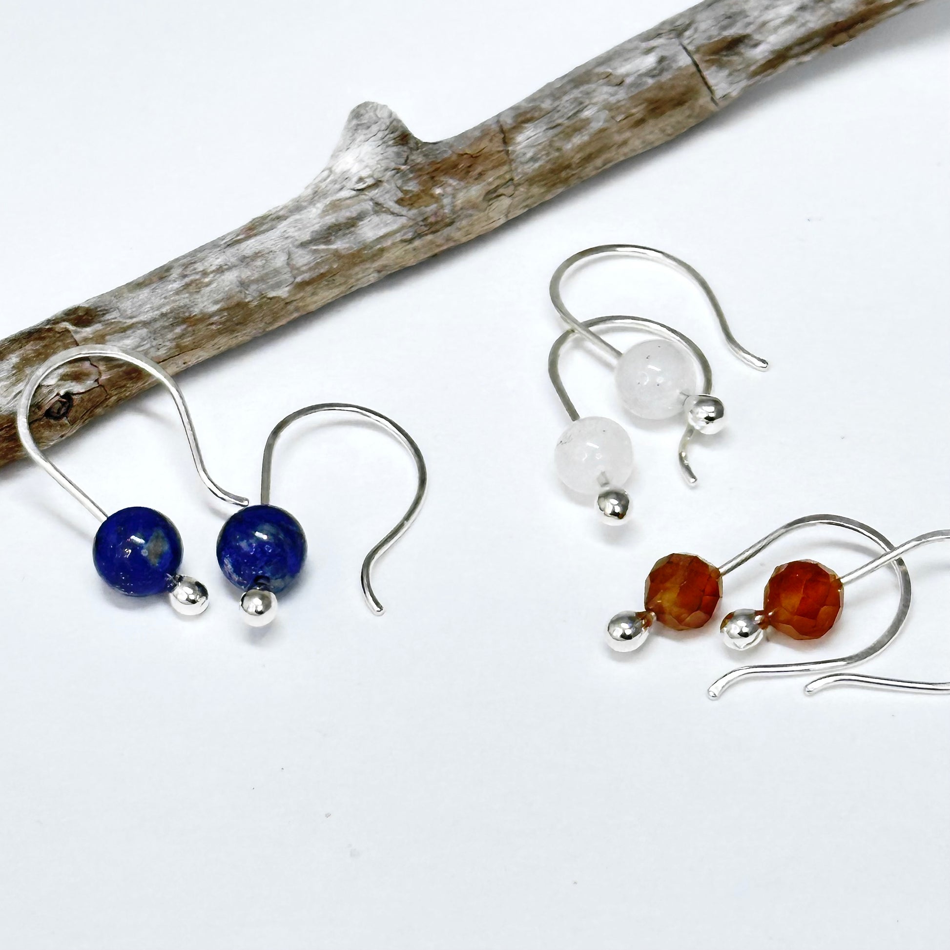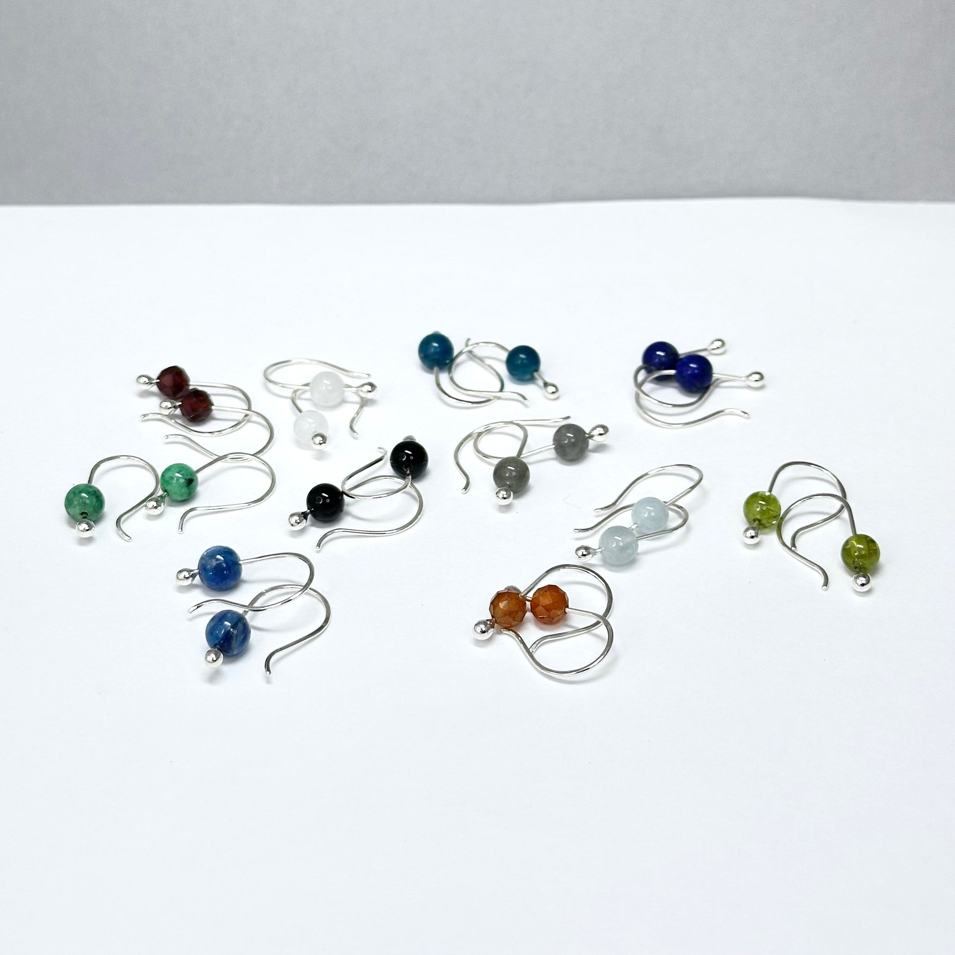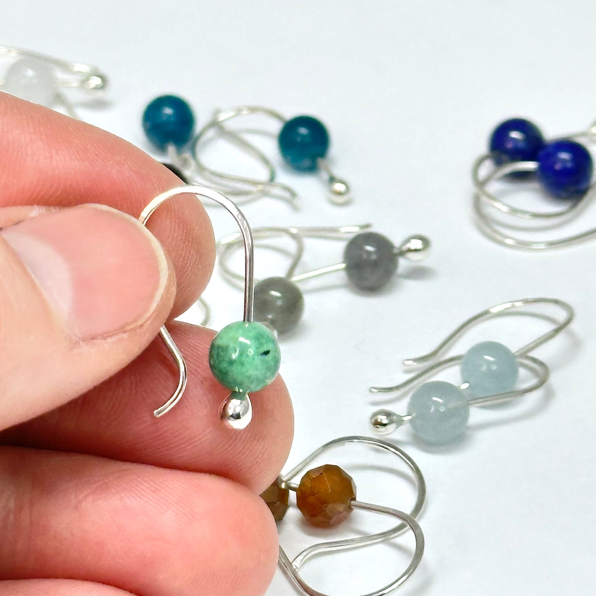 Hanni's small sterling silver gemstone hook earrings are a great minimalist earring and so easy to wear! She melts a bit of the silver to make a teardrop at the end of the hook to hold on the stone, adding a bit a flash. Each earring is then formed and hammered for strength, and the end of the ear wire rounded...no sharp ends here! Makes a perfect gift for the active person in your life who needs cool, handmade earrings. Made with Argentium (.940 silver, tarnish resistant) and your choice of stone in our northern Michigan studio, ships with silicone stoppers in our signature gift box.
