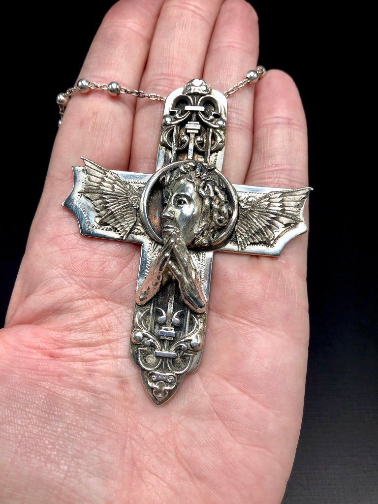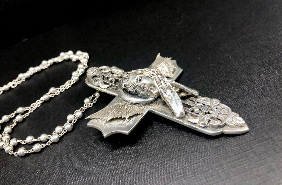 This large, intricate sterling silver cross pendant is a sculpture in and of itself. The detail in the face, the hands, and the beauty of the cross itself are truly something to behold.