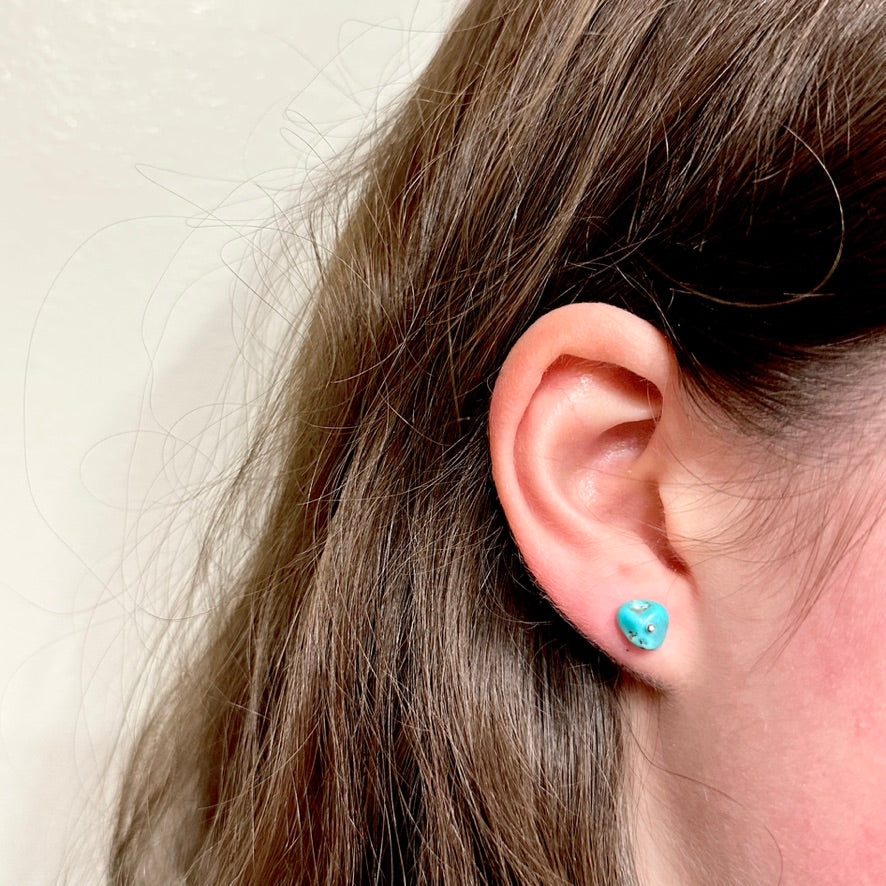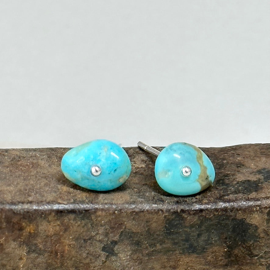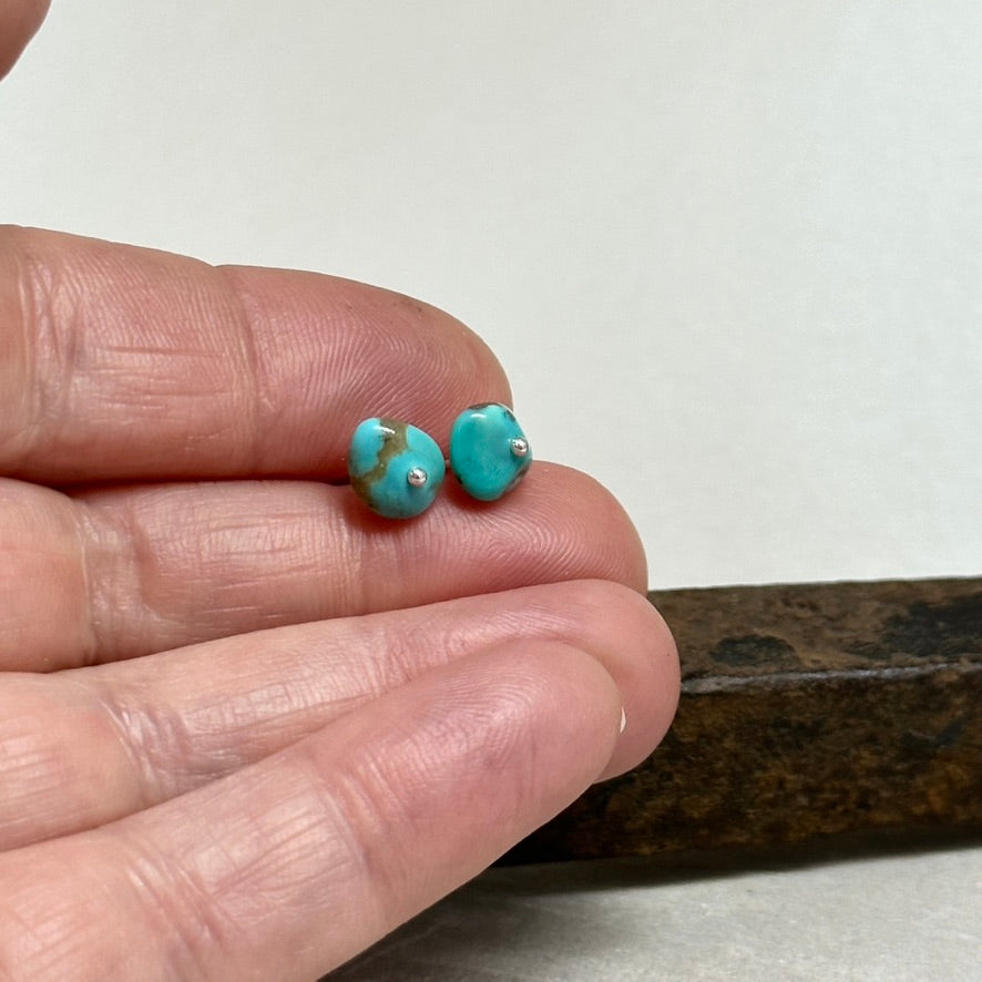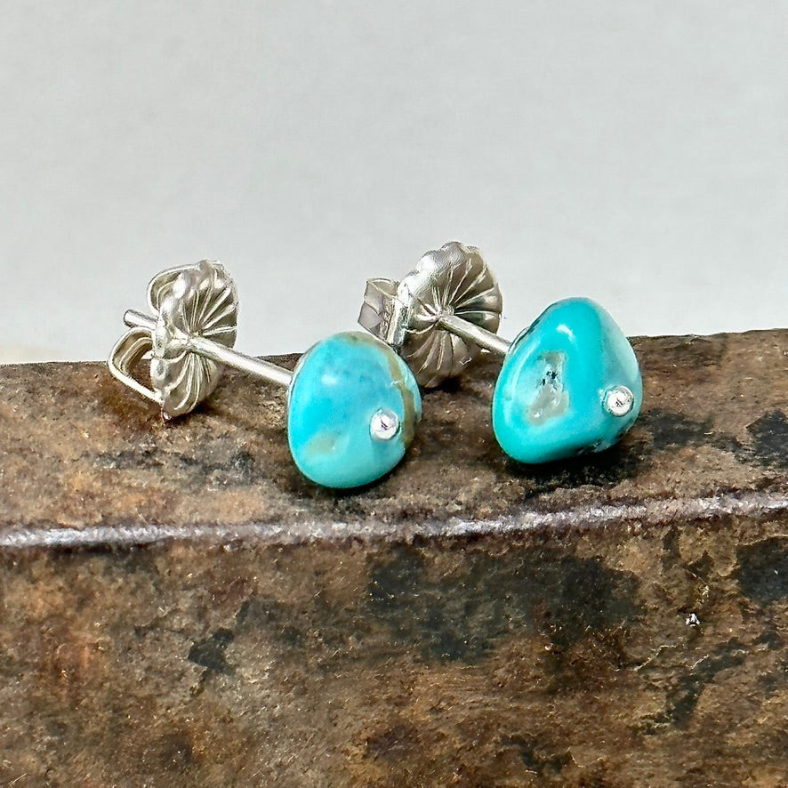 Add a pop of color to your everyday look with our stunning turquoise stud earrings! Artist handmade in our Harbor Springs studio, Hanni's little turquoise post earrings are made with sterling and Argentium silver and feature eye-catching pieces of natural Campitos turquoise. The simple yet elegant design is pinned securely with a melted silver ball, and is notched near the ends of the posts and polished on the tips to make them super comfortable. Because of how these are made, it is normal if the stones spin a bit on their setting. Perfect for adding a touch of bohemian charm to any outfit, these earrings are sure to become your go-to accessory. Ships in our signature silver jewelry box.